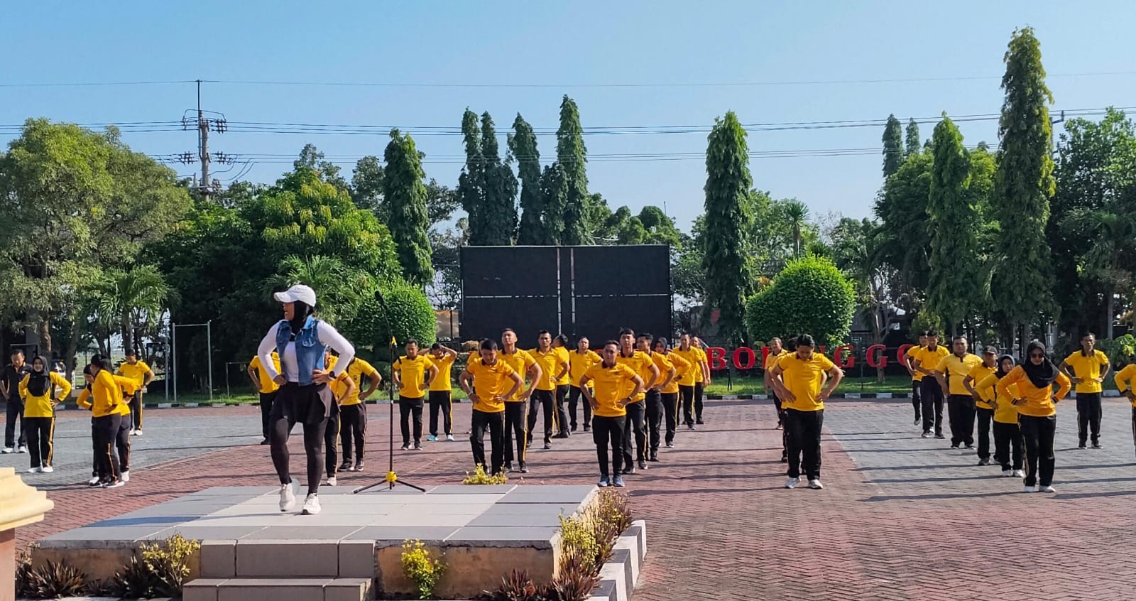 Gerakan yang dilakukan secara serempak mencerminkan kekompakan dan kedisiplinan para anggota. Di bawah langit biru yang cerah, suasana kebersamaan terasa begitu kuat, memperlihatkan sisi humanis dari institusi kepolisian dalam menjaga kesehatan dan solidaritas internal.